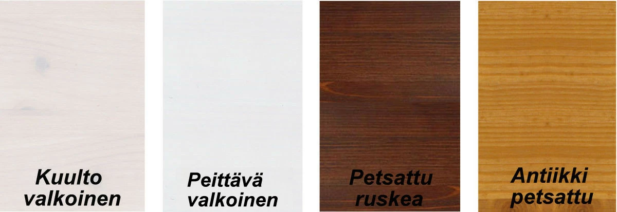 - Petsivärit kuultavia. Puun syyt heijastuvat kauniisti värin alta läpi. Peittävä valkoinen peittää pinnasta n. 95%