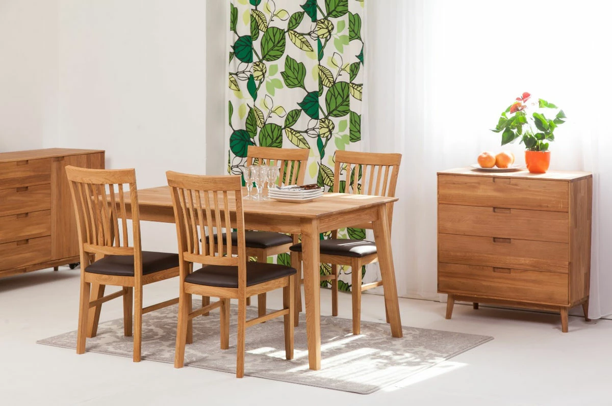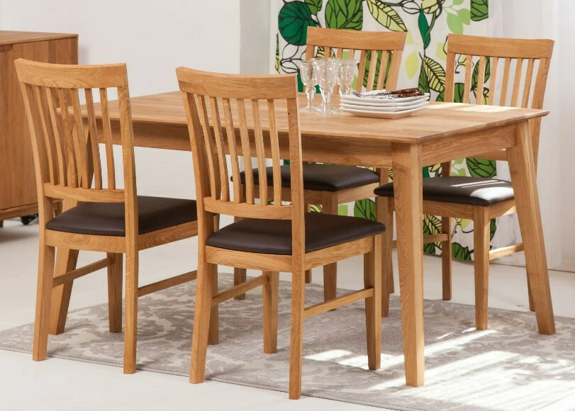 Korkealaatuinen, massiivitammesta valmistettu Genf-ruokailuryhmä neljällä pehmustetulla tuolilla.