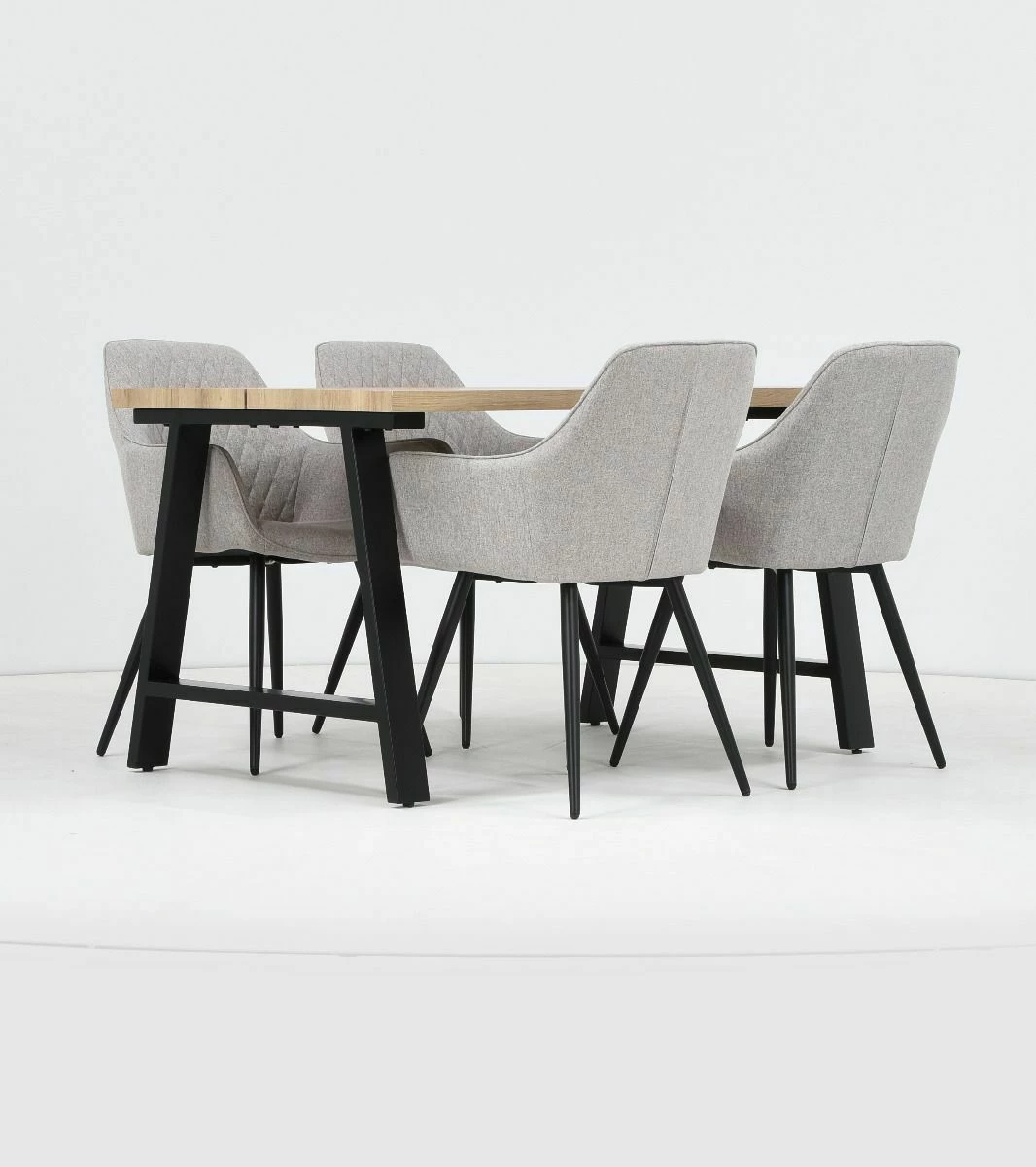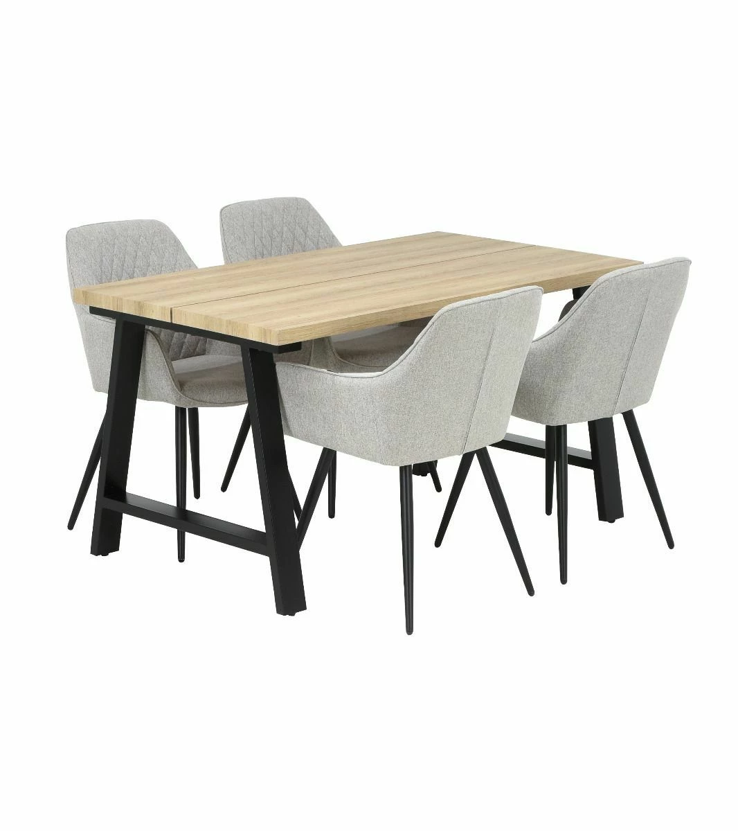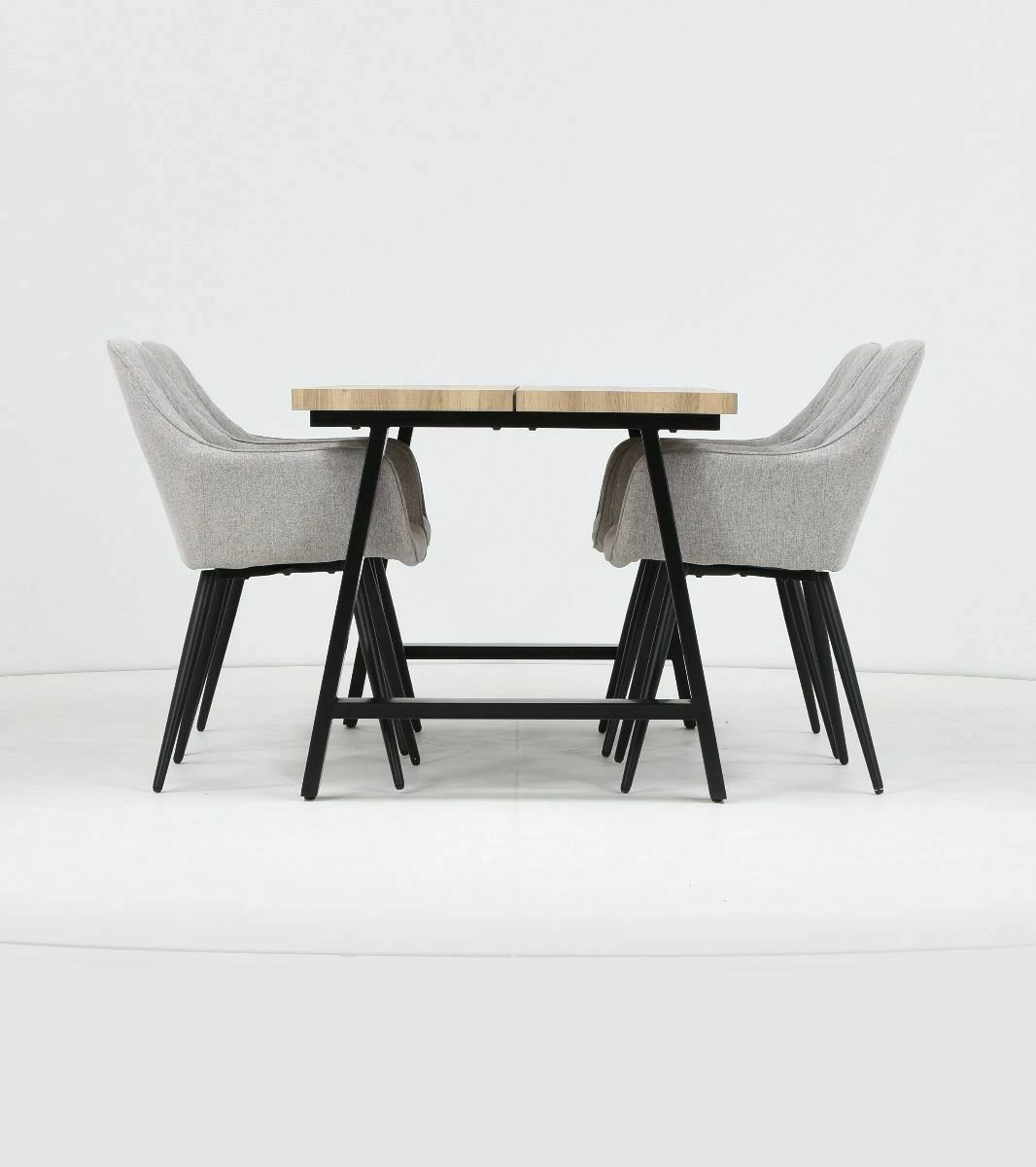 Kielo ruokailuryhmässä on tukeva metallijalka mustan ja tammen väriyhdistelmällä sekä neljä tyylikästä kangastuolia.
