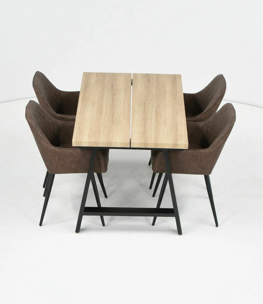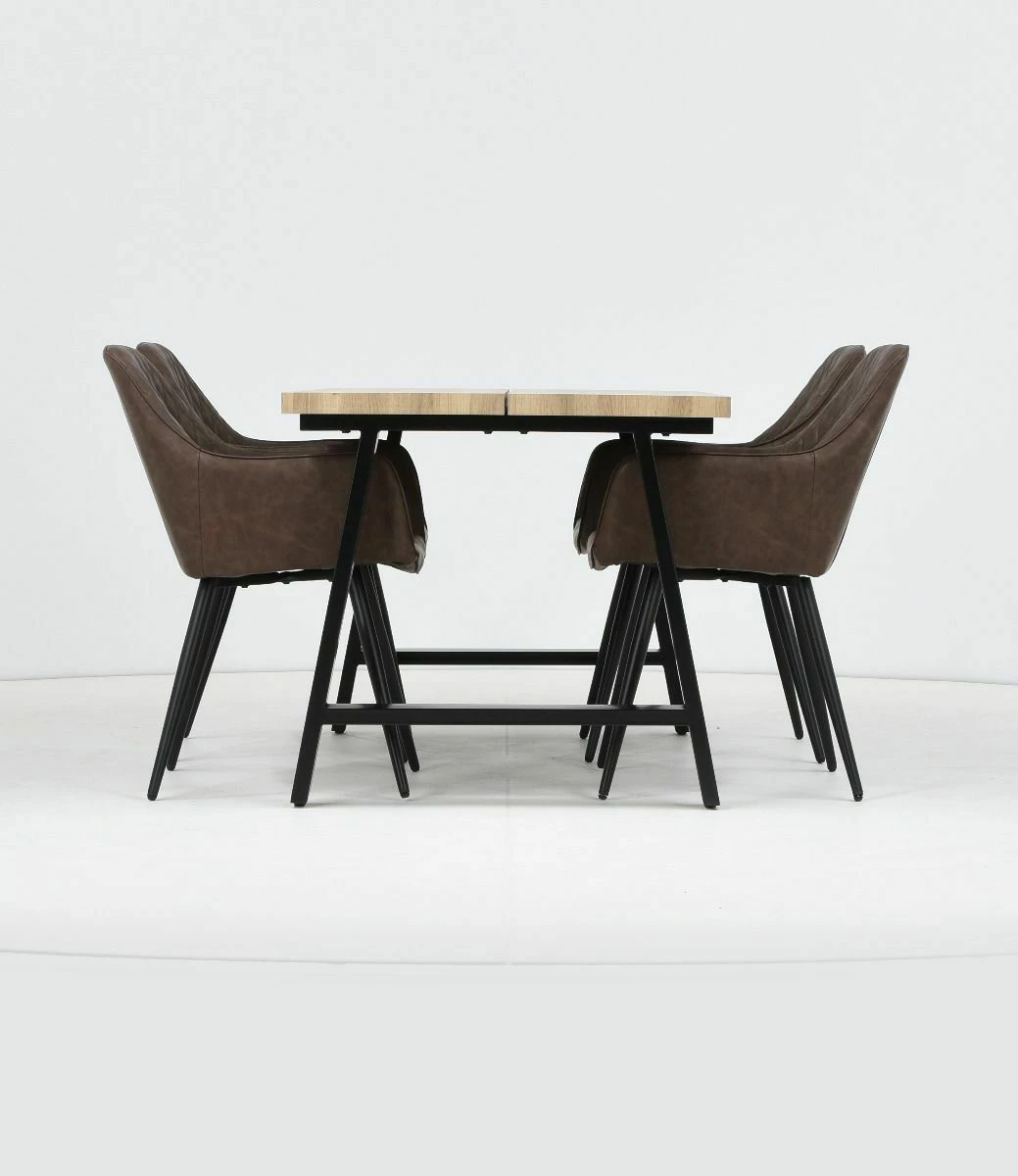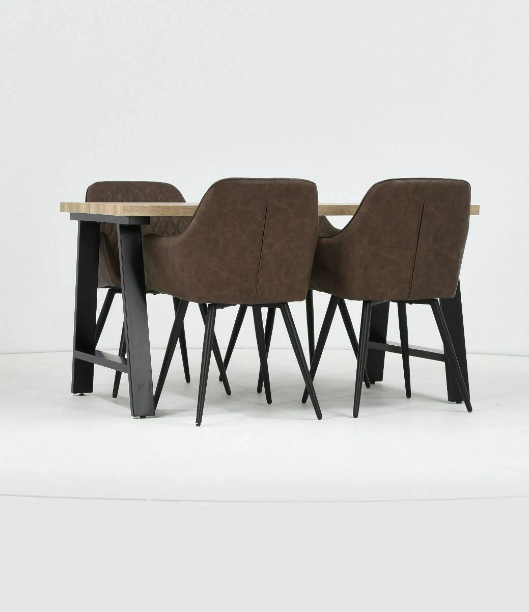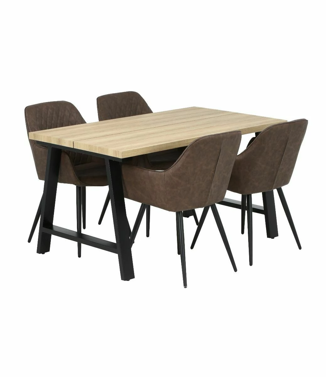 Kielo ruokailuryhmässä on tukeva metallijalka mustan ja tammen väriyhdistelmällä sekä neljä tyylikästä keinonahkatuolia.