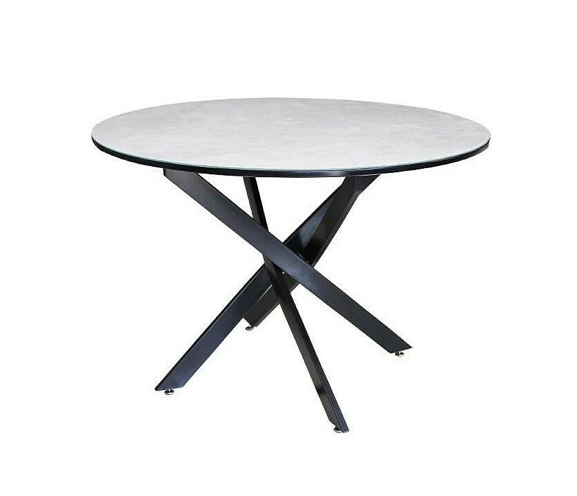 Marmojäljitelmäkantinen ruokapöytä metallijaloilla.