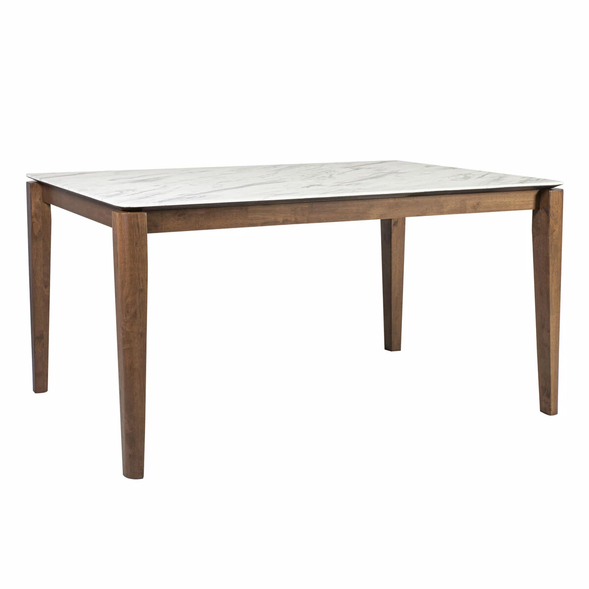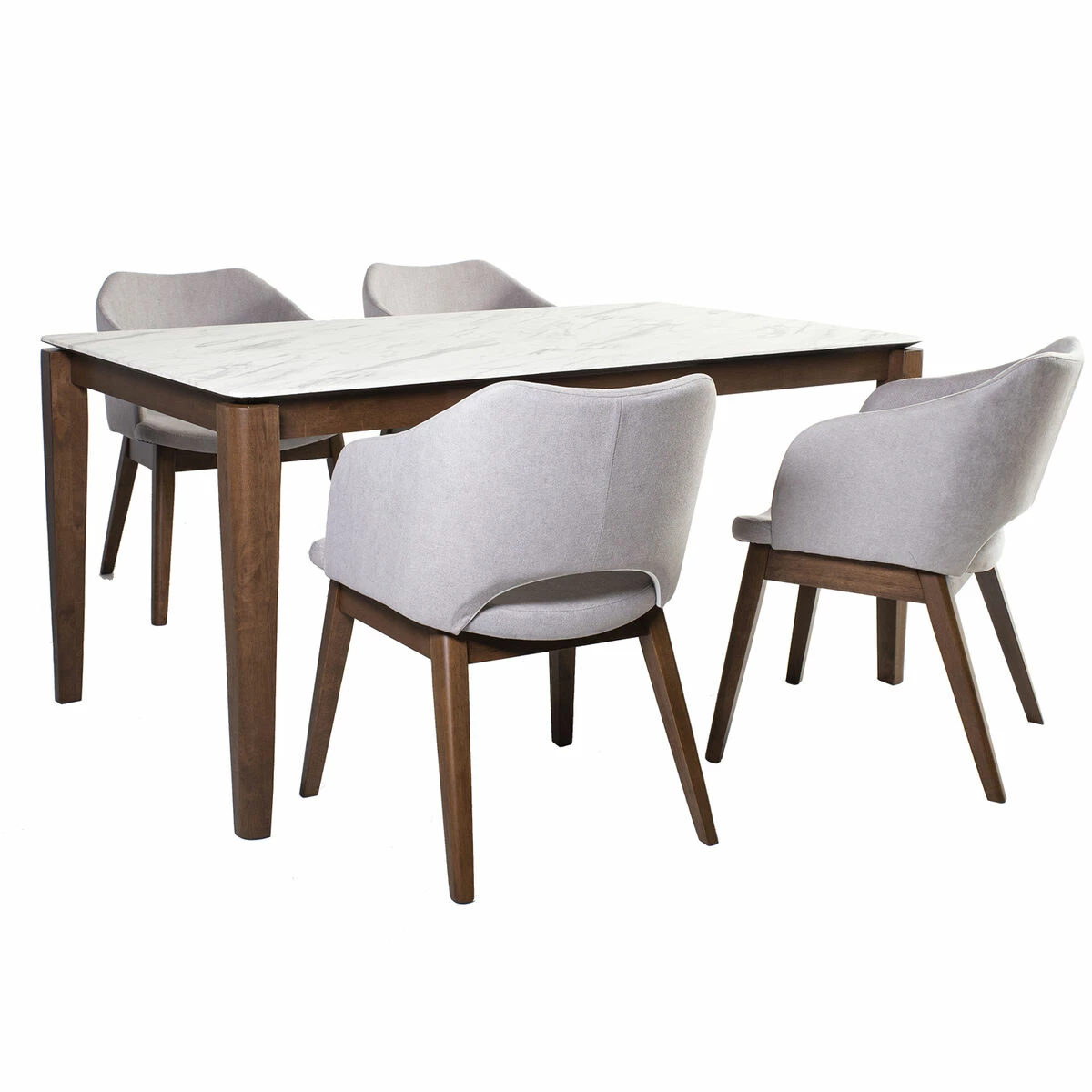 Näyttävä Salute ruokailuryhmä kauniilla marmorikuvioidulla pöydällä sekä neljällä verhoillulla tuolilla.