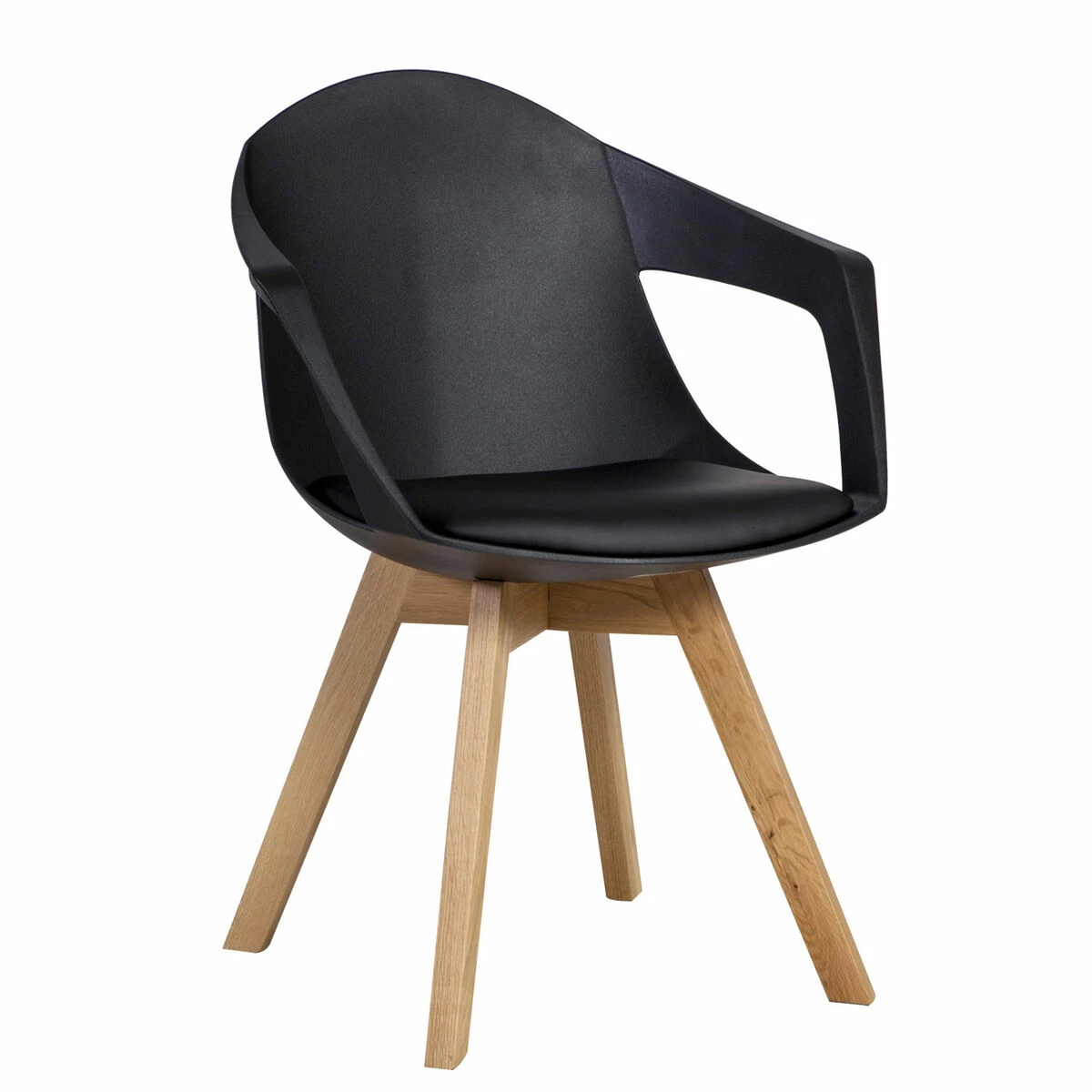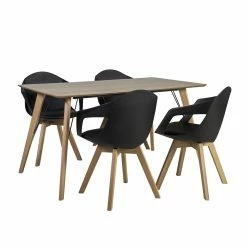 Siro Sonja ruokailuryhmä neljällä mustalla tuolilla ja kauniin sirolla tammipöydällä.