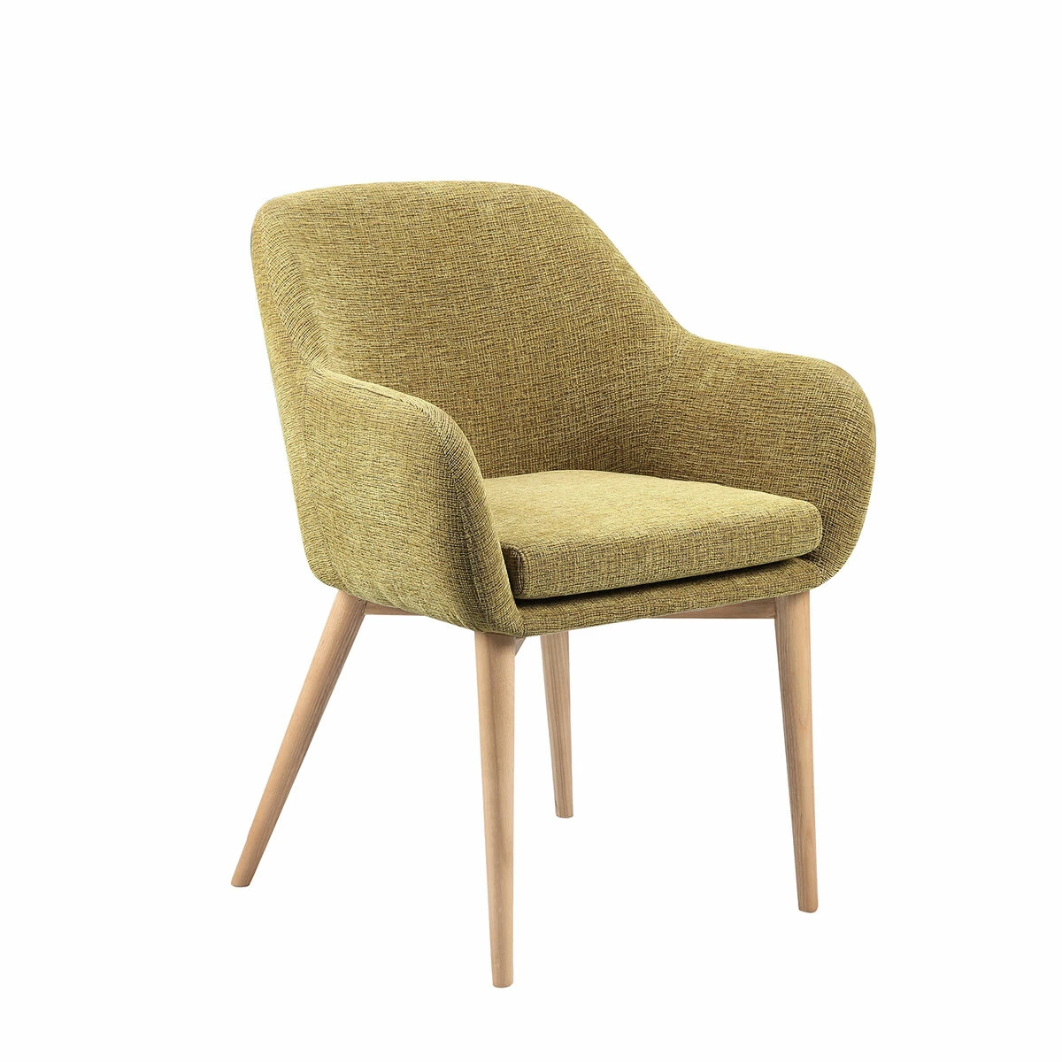 Kangasverhoiltu ruokapöydän tuoli massiivisaarni jaloilla.