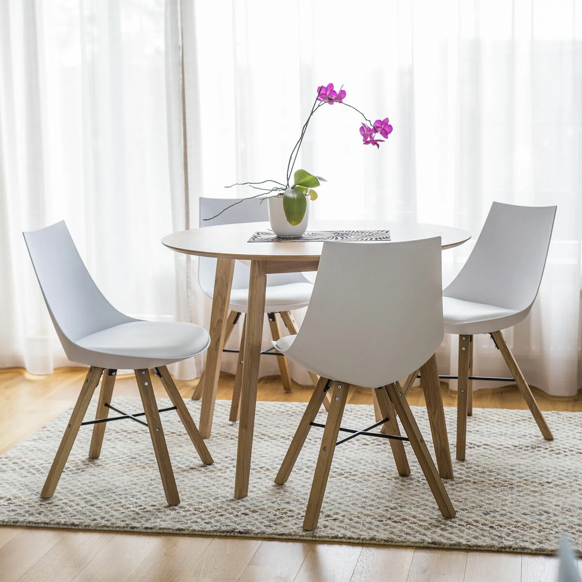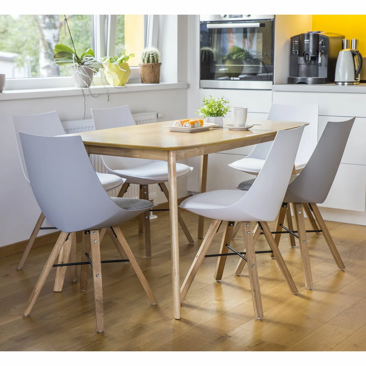 Modernisti muotoillut Seiko ruokatuolit ovat trendikäs yhdistelmä helppohoitoista ja kestävää muovia sekä massiivitammea.