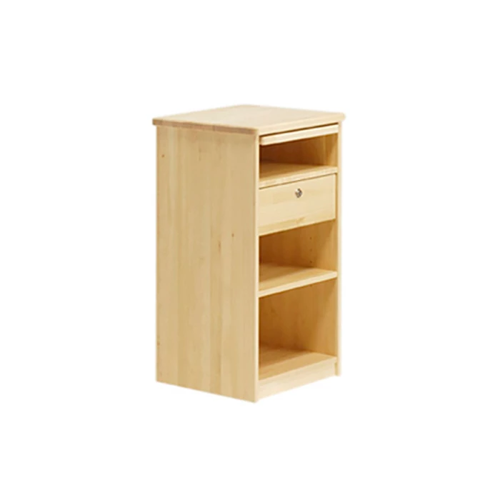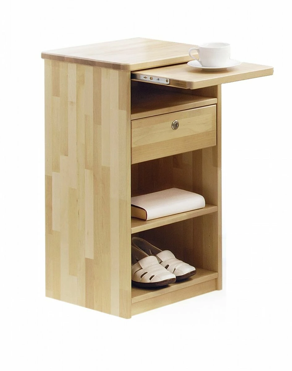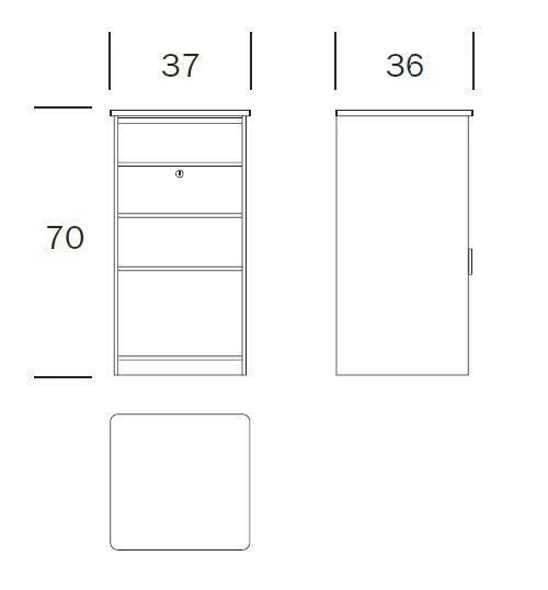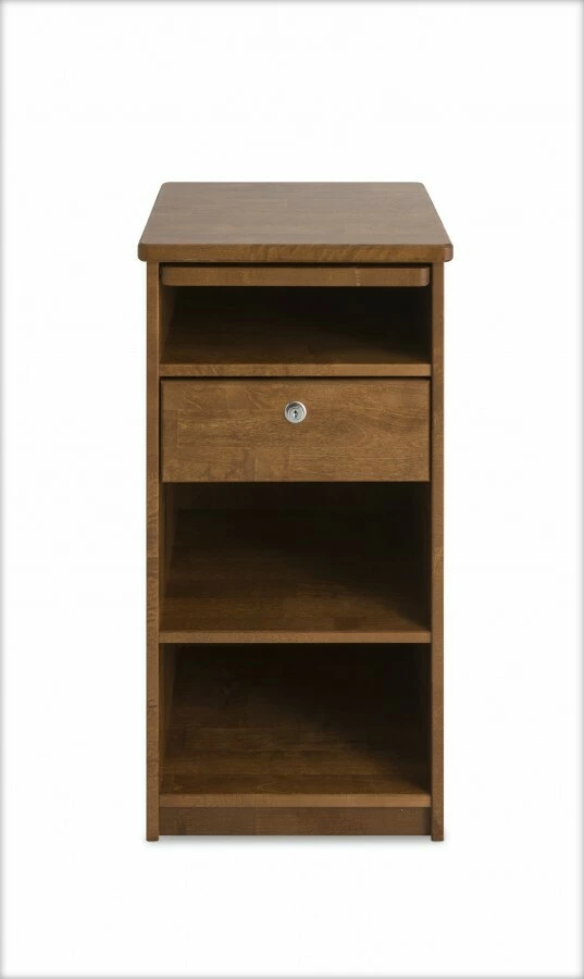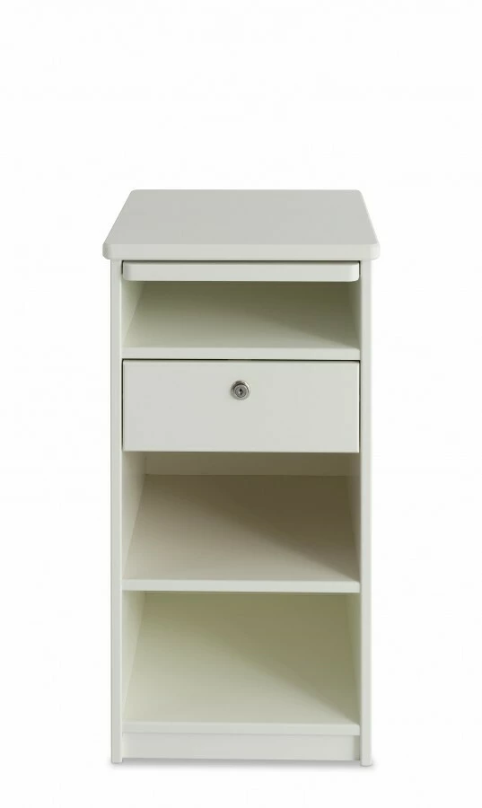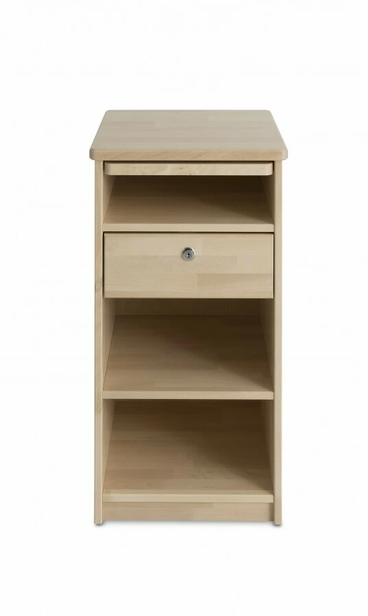- Pöydässä lukollinen laatikko, vetotaso ja kolme avohyllyä