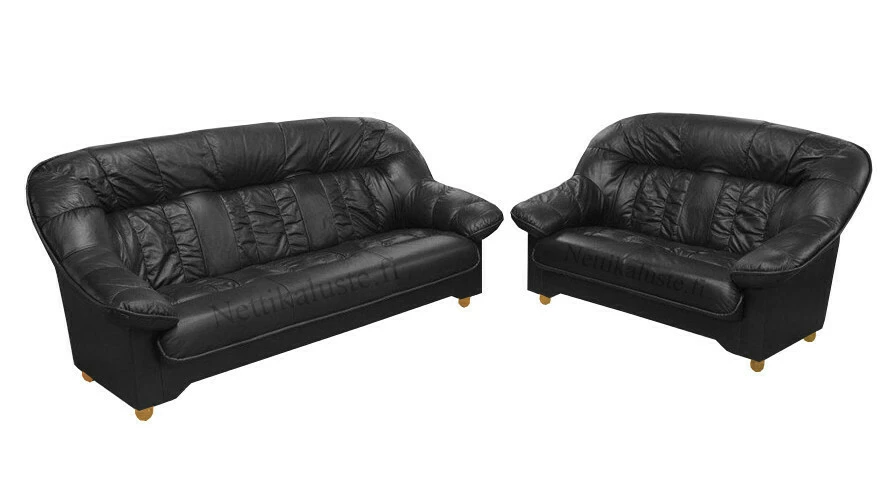 Verhoilumateriaalina laadukas läpivärjätty Madras-nahka kestää kulutusta pitkään. Taustat ovat keinonahkaa. Pyöreät jalat ovat massiivipuuta kahdessa värivaihtoehdossa.