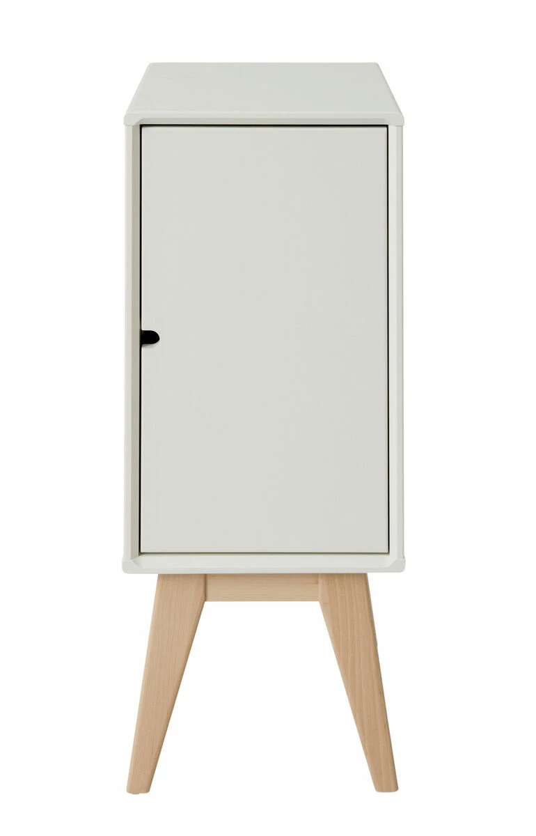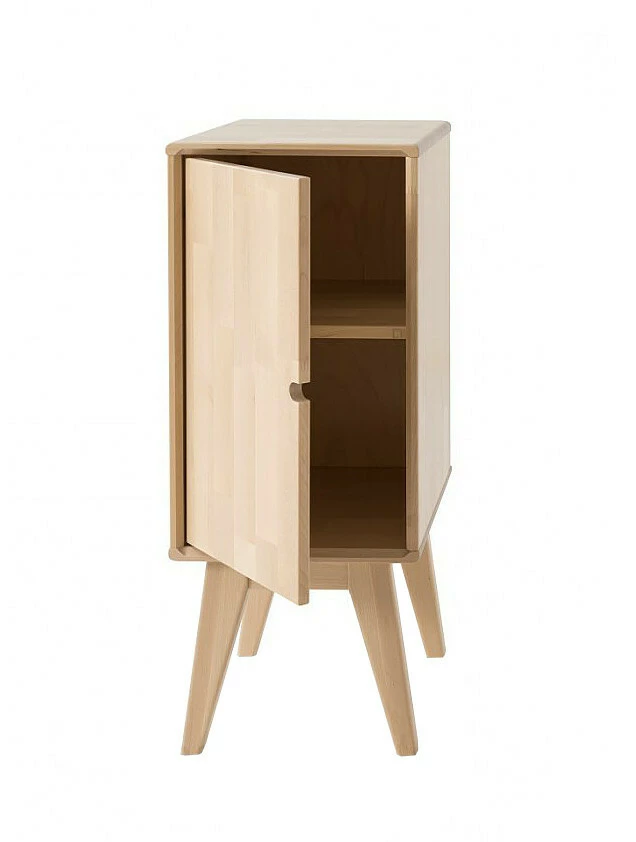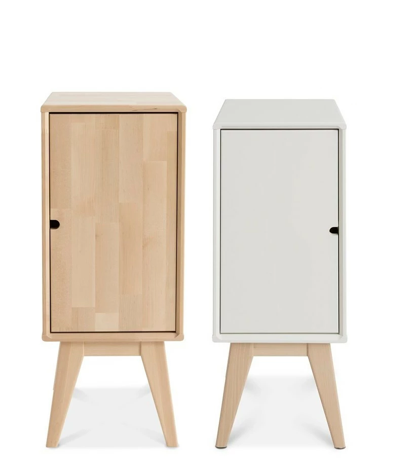 Kevyt ja kaunis, kotimainen kokokoivuinen yöpöytä ovikaapilla.